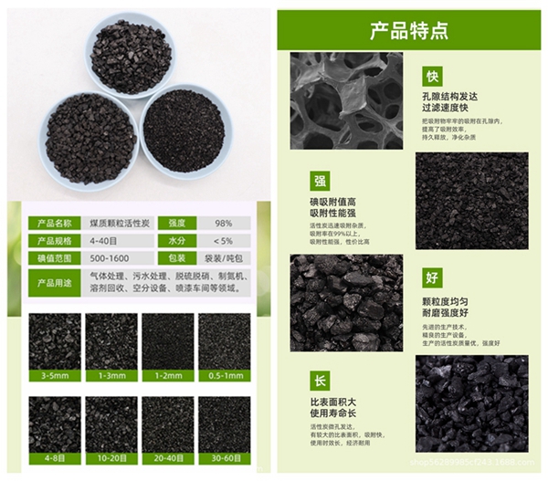 煤質顆粒活性炭選用優質無煙煤為原料,采用先進工藝加工精制而成。外觀為黑色柱狀顆粒。具有孔隙率發達、比表面積大、吸附力強、機械強度高、易反復再生、造價低等特點。用于有毒氣體凈化、廢氣處理、工業和生活用水的凈化處理、溶劑回收等方面。